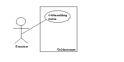 Der Kasten stellt das SuD dar. Außerhalb wird der Primary Actor als Strichmännchen dargestellt. In einer Blase innerhalb des SuD werden die einzelnen Use Cases dargestellt. Jeder Use Case ist eine eigene Blase. Eine Linie vom Primary Actor zu einem Use Case zeigt, welchen Use Case dieser Primry Actor anstößt.